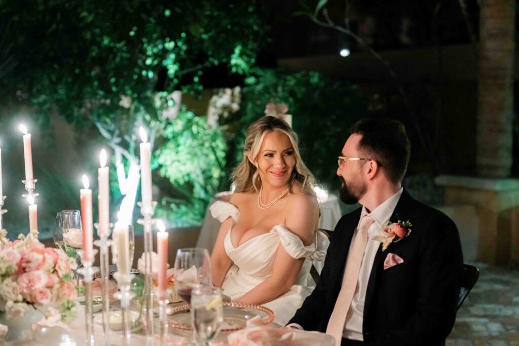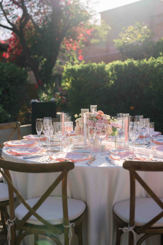 As the sun set, guests made their way to the central courtyard for dinner. The courtyard at the Royal Palms Resort transformed into a candlelit reception space lined with pink florals and white linens. The romantic tones felt throughout the day were front and center in this space. The warm stone walls of the courtyard held onto the evening light, feeling like a beautifully hosted dinner party beneath the desert sky.
